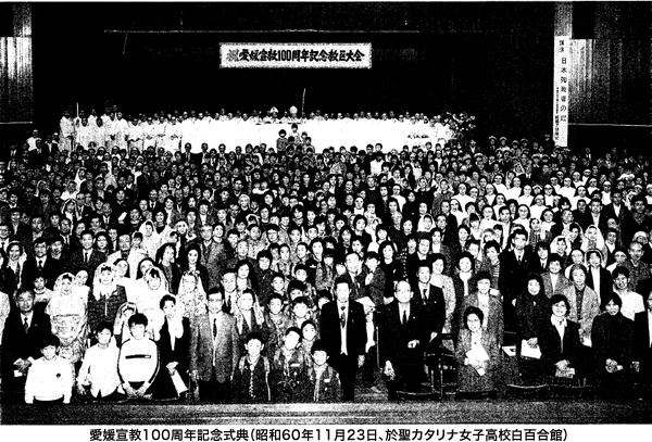1885(明治18)年、ペトロ深堀達右衛門神父が松山に巡回伝道したことをもって愛媛宣教の嚆矢とする。爾来100年の宣教の歩みを記念して、1985(昭和60)年、松山において記念祭が計画された。愛媛地区信徒使徒職協議会は記念すべき年に先立つ1年を「愛媛宣教百年の特別聖年」と定め、「特別聖年の祈り」を作り、愛媛地区の各教会では毎日曜日ミサ後にそれを唱えてきた。特に松山教会にとっては創立100年祭をも意味する出来事であり、特別な行事を加えた。特別聖年の間、毎日当番になった信徒は聖体訪問をして「特別聖年の祈り」を唱えること、毎土曜日当番になった信徒の家庭でロザリオの祈りをする集会が開かれたことである。また巡礼団を組織して長崎に旅して、愛媛宣教の先達者であるペトロ深堀達右衛門神父の墓に参り、キリシタン時代の殉教者たちの遺跡を訪ねた。さらにローマ教皇ヨハネ・パウロ二世から松山教会創立100年の祝辞をいただいたのは名誉なことであった。 11月23日、教皇大使ウイリアム・アクイン・カルー大司教と深堀敏高松司教、パリー外国宣教会日本地区長ジャン・ワレ神父、至聖ロザリオ管区長の代理ロマン神父、教区内の各地から多くの司祭や信徒を迎えて、聖カタリナ高校白百合館を会場に記念式典が挙行された。午前中は長崎二十六聖人記念館長結城了悟神父の「殉教者の心」と題した講演があり、正午より教皇大使を主祭として48名からなる司祭団の共同ミサが捧げられた。その後で祝宴が聞かれた。この記念祭には愛媛宣教の先達者で、あるペトロ深堀達右衛門神父の長兄の孫にあたる深堀信二氏も招待された。これを記念して愛媛地区信徒使徒職協議会が編纂した「愛媛宣教百周年」と題する記念誌が発行され、その中で愛媛宣教100年の歴史、各教会の現状、興味深い思い出などが紹介されている。