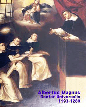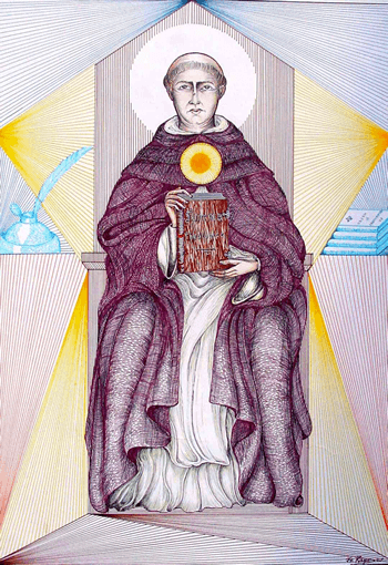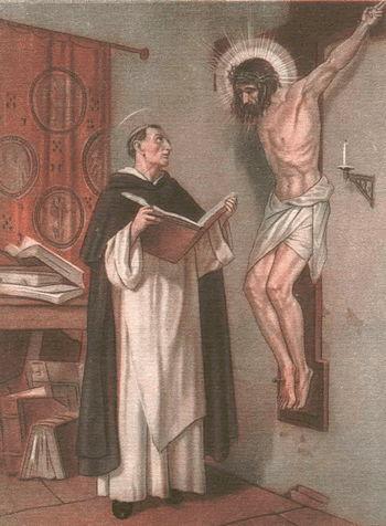 これらのことを理解したドミニコは、会員達をパリ大学やナポリ、バレンシア大学に送り、特に聖書学、神学、哲学や科学に関する勉強をさせ、出来れば教授になることもすすめ励ましました。これは丁度、トマス・アクィナスが歩いた道と同じであり、彼はドミニコ会にとって、素晴らしい模範です。前にも書きましたが、トマス・アクィナスは正統な説教をする知恵を、神の子であり、人間であるイエズスとの親しい交わりによって得ていました。ある日、フランシスコ会の聖ボナベントウラが聖トマスに、その知恵はどんな本から受けとったのかと尋ねると、彼は黙って自分の机の上の十字架につけられたイエズスを差し示し、「この”本”から、その力を学んだ。」と答えたそうです。トマス・アクィナスは偉大な人であり、わたし達は小さい者にすぎません。わたし達がトマスに真似るのが、無理なことであるのはわかりますが、何か良い方法はないでしょうか。小人は巨人の肩に乗っていますと、巨人の歩む道を共に歩むことができます。勿論、肩に乗るという表現は、霊的な意味ですが、これを生かすように努力するならば、素晴らしい結果が出てくると思います。
