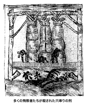 前述の平山常陳事件で、オランダ商人が逮捕したフローレス神父とアウグスチノ会のスニガ神父を拷問にかけて宣教師であることを自白させ、長崎奉行所につきだした。2人は船長のホアキン平山常陳と船員12名と共に平戸から長崎西坂の刑場に引き出された。国鉄長崎駅の広場を横切るとNHK長崎支局があるが、その横の坂道を登れば二十六聖人記念碑がある。そこは日本二十六聖人が十字架につけられた場所である。1622(元和8)年8月19日、その同じ場所で12名の船員は斬首され、2人の神父と船長は長く苦しむようにと緩やかな火で焼き殺された。